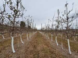 En cambio, otras variedades como la Winter Banana, requieren 400 unidades frío que de alguna manera si se llegan a acumular usando compensadores de frío: Si te fijas hay aún árboles que tienen hojas activas (verdes) pero técnicamente ya están en paradormancia