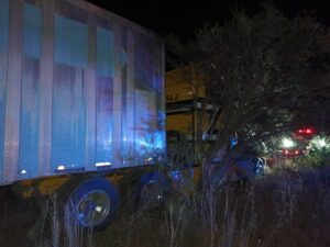 Esta noche de miércoles se registró un accidente vehicular, al salirse de la carretera un camión de carga tipo tráiler, a la altura del Kilómetro 26 + 700 de la carretera federal 23 Francisco Zarco, en el municipio de Canatlán.