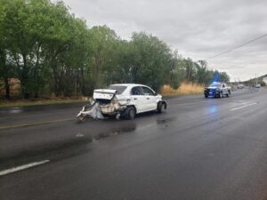 El coche blanco quedó golpeado en diversas partes, como la parte frontal delantera y la defensa trasera, que prácticamente quedó semidespegada. La conductora tiene su domicilio en ciudad Canatlán.