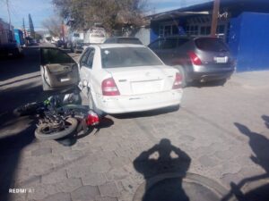 Otro choque se registró en la zona centro de ciudad Canatlán; una motociclista de 11 años impactó contra un automóvil, en la esquina de las calles Cuauhtémoc y Jiménez; solo daños materiales.