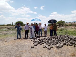 En esta imagen se observa la ceremonia en que autoridades ejidales, municipales y religiosas colocaron la primera piedra del cementerio.