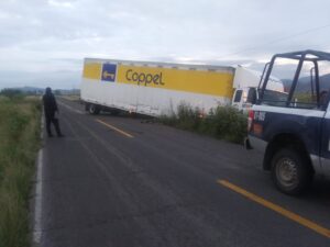 El hecho se registró la madrugada de martes, cuando la unidad, camión Internacional tipo tractor, modelo 2020, conducido por Ernesto, de 51 años de edad y domicilio en ciudad Gómez palacio, Durango, circulaba de sur a norte y en un momento dado el chofer perdió el control de la unidad, derrapando y saliéndose de la cinta asfáltica, hacia su lado izquierdo.