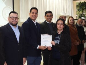 Atestiguando y participando en la entrega de reconocimientos, el regidor Marco Antonio Herrera, Carlos Gerardo Valdez Ramírez, Jefe de la Oficina Regional de Administración Educativa; Óscar Daniel Escobedo Miranda, Coordinador Sectorial Cobaed; Alejandro Montenegro Herrera, Director de la Universidad Autónoma de Durango, campus Santiago; Sandra Estela Montenegro, Directora del Coba # 10; María Inés Cardiel Cháidez, Directora del Centro de Capacitación para el Trabajo Industrial # 129.
