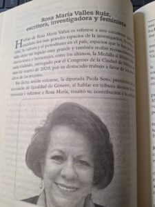 Hablar de Rosa María Valles es referirse a una canatlense que ha escalado los más grandes espacios de la investigación, la educación, la cultura y el periodismo en el país, espacios que le han permitido dejar un legado muy grande y también recibir reconocimientos, distinciones y homenajes, entre los últimos, la Medalla al Mérito Hermila Galindo, entregado por el Congreso de la Ciudad de México el mes de marzo de 2020, por su destacado trabajo a favor de los derechos de las mujeres.