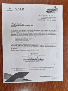 Así lo establece el oficio que con fecha 16 de mayo envió la CAED a la presidenta municipal de Canatlán Ángela Rojas Rivera a través del oficio DG/653/2025, que contiene lo siguiente: C. Ángela Rojas Rivera, Presidenta Municipal de Canatlán, Dgo