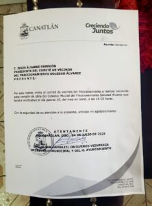 En respuesta, el gobierno municipal, a través de invitación escrita girada por Alvan Gamaliel Ontiveros Vizárraga, Secretario del Ayuntamiento, está invitando al Comité de Vecinos a realizar recorrido para revisión de obra del colector pluvial.