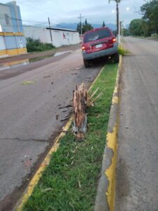 Se le ponchó una llanta y tumbó palmera en avenida de Canatlán.