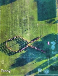 La presidenta municipal Dora González Tremillo encabezó el ceremonial y marcha, acompañada de Karla Nava, Presidenta del organismo descentralizado municipal, formando el monumental moño rosa humano sobre la cancha sintética de futbol de la unidad deportiva / CBTA 28.